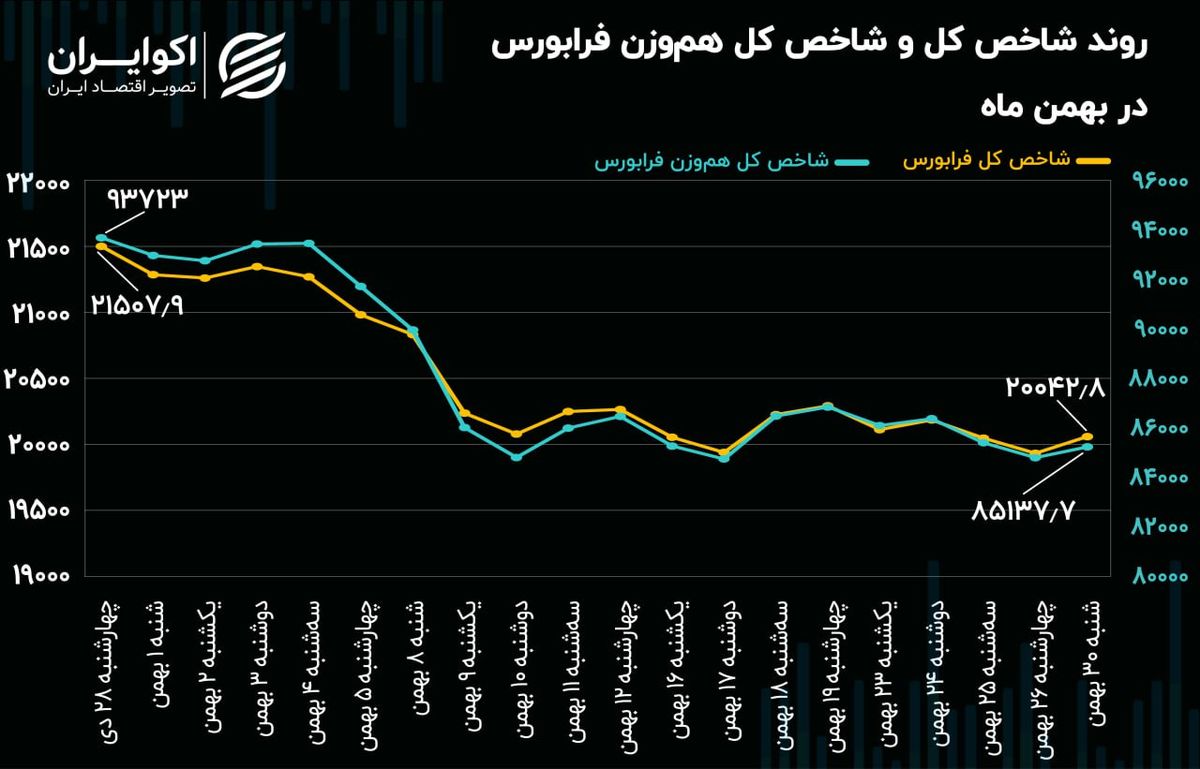شاخص کل فرابورس ایران در 19 روز معاملاتی بهمن ماه 6.8 درصد ریزش داشت و از تراز 21 هزار و 508 واحدی به تراز 20 هزار و 43 واحدی کاهش یافت. شاخص کل هم وزن فرابورس ایران نیز در این ماه از تراز 93 هزار و 723 واحدی با 9.2 درصد کاهش به تراز 85 هزار و 138 واحدی رسید. ریزش بیشتر شاخص هموزن نشان میدهد که سهمهای سبک فرابورس از نمادهای شاخصساز این بازار به نسبت، کاهش قیمت بیشتری را تجربه کردند. تفاوت بازدهی شاخص کل و هموزن بورس تهران در بهمن ماه کمتر از 2 دهم بوده و این تفاوت نمادهای سبک و سنگین در بورس تهران کمتر از فرابورس ایران بودهاست. شاخصهای قیمتی فرابورس نیز در این ماه نوسانات مشابهای به نسبت شاخص کل این بازار داشتند.